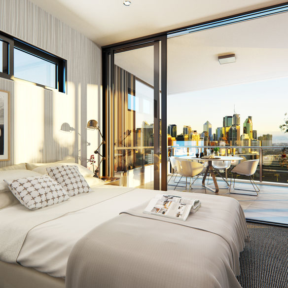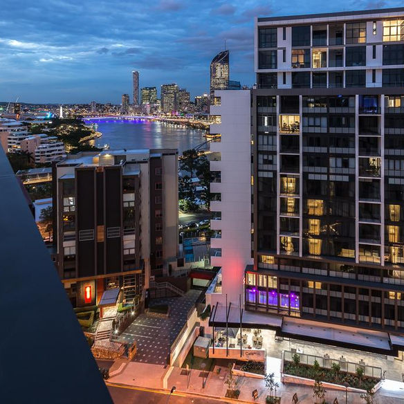 As different parts of the building have a unique outlook, the building itself is made up of several distinct elements. The Northern rooms and apartments form a pattern of glass and balconies looking towards the city and river whilst the South-East and South-West corners are expressed as vertical elements framing the corner suites and units. The southern façade acknowledges several surrounding iconic buildings such as the Lady Cilento Children’s Hospital and Ronald McDonald House.